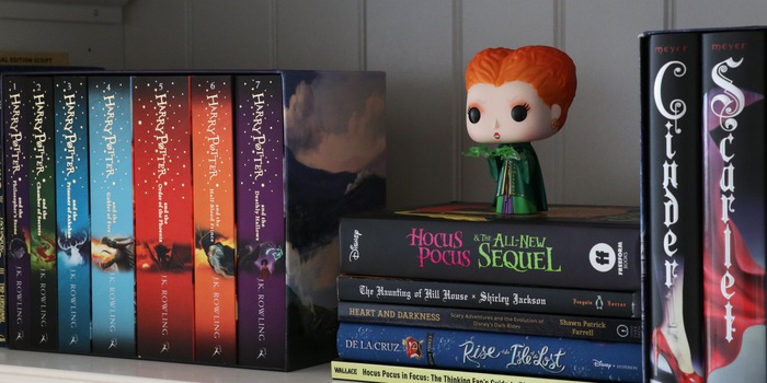 In der öffentlichen Bibliothek sind die unterschiedlichen Fachgebiete und literarischen Gattungen einfach angeschrieben. Bei mir zu Hause übernehmen spielerische Accessoires diese Funktion: Funkopop-Figuren, eine Tassilo-Tasse, Aladdins Wunderlampe, eine Schneekugel, eine Disney-Autoplakette oder eine Glasphiole.