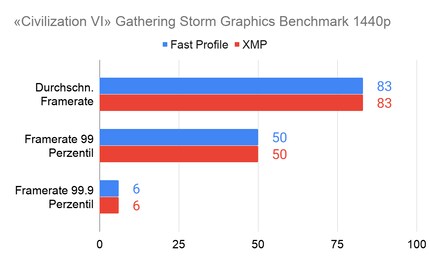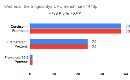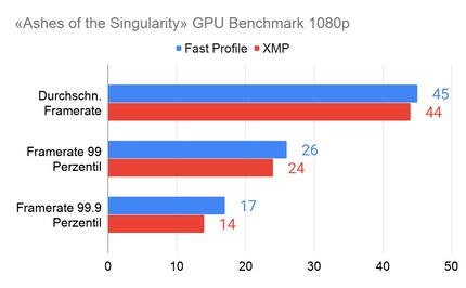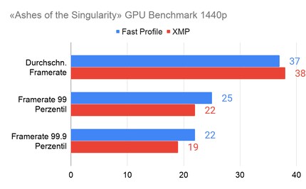 Weniger deutlich sind die Unterschiede in «Ashes of the Singularity». Lediglich ein FPS liegen die Fast-Einstellungen im Schnitt beim CPU-Benchmark vorne. Beim 99 Perzentil sind es nur zwei FPS und beim 99.9 Perzentil liegen beide Einstellungen gleichauf. In 1440p machen die Timings keinen Unterschied. Der GPU-Benchmark liefert in 1080p bis auf das 99.9 Perzentil dieselben Ergebnisse wie der CPU-Benchmark. Beim 99.9 liegt das Fast-Profil mit drei FPS vorne. Beim 1440p-GPU-Benchmark liefert XMP zwar die bessere durchschnittliche Framerate, dafür hat das Fast-Profil die Nase beim 99 und 99.9 Perzentil vorne.