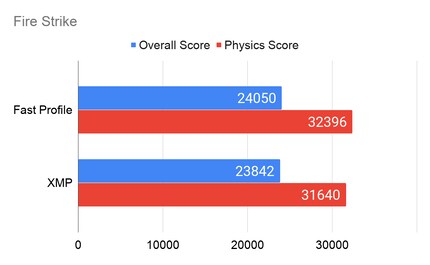 Die beiden Game-Benchmarks sprechen eine noch deutlichere Sprache: Beim Tîme Spy Physics Score, also dem CPU-lastigen Test, ist der Score beim Fast-Profil 13 Prozent höher als bei XMP. Bei Fire Strike ist der Unterschied weniger auffällig: Hier bringt das Fast Profile beim Physics Score nur drei Prozent mehr. Dennoch: Im Vergleich zu meinen ersten Gehversuchen mit den Memory Timings sind grössere Unterschiede ersichtlich.