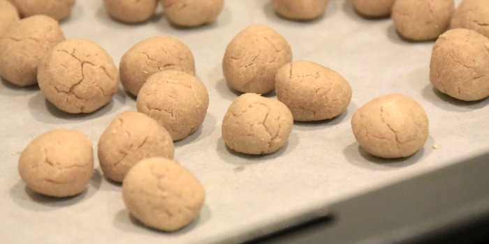 Langsam, aber sicher läuft es rund. Ich rolle aus dem Teig kleine Bällchen und lege sie aufs Backblech. Das letzte, grosse Teigstück knete ich zu einer Katzenpfote.