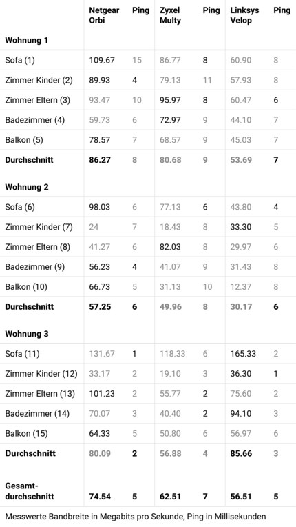 Wie man sehen kann, konnte das Netgear Orbi über alle Messungen betrachtet am meisten überzeugen, gefolgt vom Zyxel Multy und dem Linksys Velop. Das zweitplatzierte Zyxel Multy erreichte zwar weniger Spitzenwerte als das Linksys Velop, konnte jedoch im Mittel die Datenpakete schneller befördern.
