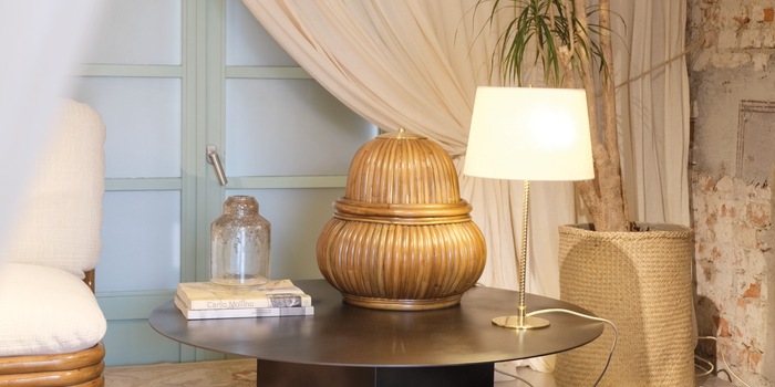 Die Temporanea Galleria war vielleicht der einzige Ort, an dem ich ohne Schuhe durch die Ausstellung laufen durfte, was mir an 20 000-Schritte-Tagen gleich entgegenkam. Aber es war auch eines der wenigen Events, die auf ein imposantes Gebäude verzichteten und doch herausstachen. Denn die gesamte Galerie wurde mit Packpapier ausgekleidet. Bis auf ein kleines Stück Rohputz bei einem Loch, war nichts mehr von der Architektur zu sehen. Hinter dem simplen und doch effektvollen Konzept steckten Guglielmo Giagnotti und Patrizio Gola. Sie sind die Gründer von Studioutte, einem in Mailand ansässigen multidisziplinären Büro für Innenarchitektur, Dekoration und Sammlerdesign. Genauso hybrid wie ihr Designverständnis wirkte ihre Inszenierung auf mich. Vor allem der Tisch, der durch das besagte Loch in der Wand bis ins nächste Zimmer reichte.