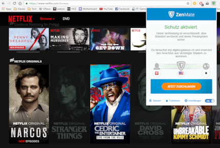 Mit der Zenmate-Erweiterung kann man im Browser bequem auf US-Streaming-Seiten zugreifen.Funktioniert Buffered auch nicht mehr, hilft euch Google weiter. Eine gute Anlaufstelle, um heruauszufinden, ob der VPN-Dienst für Netflix funktioniert, ist auf der entsprechenden Facebook-Seite des Anbieters vorbeischauen. Meistens beschweren sich dort die User, wenns mit Netflix nicht mehr klappt.