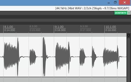 Eine Latenz über 10 Millisekunden ist bereits störend. Mein Computer schafft ohne spezielle Treiber nicht unter 26 ms. So habe ich testweise versucht, den Takt zu treffen. Man sieht sehr schön, dass mir das nicht gelungen ist: Die Schallwellen beginnen nicht bei den gestrichelten Linien.MT PowerDrumkit 2 ist ein kostenloses Plug-in, an dem es nichts zu meckern gibt. Es bietet zwar nur ein Schlagzeug-Kit, aber das klingt dafür gut. Viele vorgefertigte Drum-Patterns werden mitgeliefert.