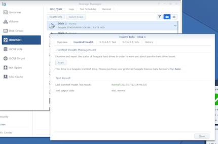 Das IronWolf Health ManagementDas IronWolf Health Management klingt nicht nur badass, sondern ist dazu da, eine weitere Schicht Ausfallsicherheit zu schaffen. Du findest es unter Storage Manager → HDD/SSD und dann nach dem Klick auf eine der Platten. Du kannst deine Platten entweder manuell oder automatisch regelmässig durchchecken lassen. Meine Platten sind, wenig überraschend, alle im grünen Bereich.