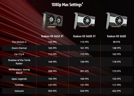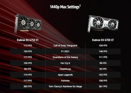 Die beiden weiteren, neuen Modelle sind die Radeon RX 6750 XT und die RX 6650 XT. Die 6750 XT baut auf der 6700 XT auf und bringt neu eine Game-Taktrate von 2495 MHz (plus 71 MHz) und einen Boost von 2600 MHz (plus 19 MHz). Die Speicherbandbreite beträgt neu 432 Gigabyte pro Sekunde (bisher 384). Bei der RX 6650 XT handelt es sich um den Refresh der 6600 XT mit einer Taktrate von 2410 MHz (plus 51 MHz), einem Boost von 2635 MHz (plus 46 MHz) und einer Speicherbandbreite von 280 Gigabyte pro Sekunde (bisher 256).