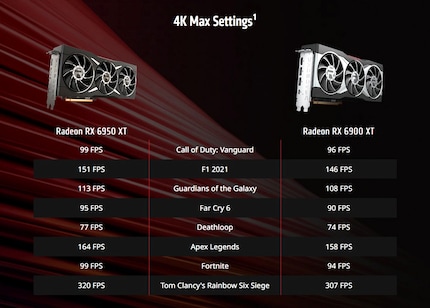 Alle anzeigenAMD bringt drei neue Grafikkarten auf den Markt, die eine grössere Speicherbandbreite und erhöhte Taktraten aufweisen. Das neue Spitzenmodell baut auf der Radeon RX 6900 XT auf und trägt die Bezeichnung RX 6950 XT. Sie weist beim Gamen eine Taktrate von 2100 MHz und einen Boost von 2310 MHz auf – ein Plus von 85 und 60 MHz. Beim Speicher wird neu auf solchen mit einer Geschwindigkeit von 18 Gigabit pro Sekunde anstelle 16 gesetzt, was zu einer erhöhten Speicherbandbreite von 576 Gigabyte pro Sekunde gegenüber bisher 512 führt.
