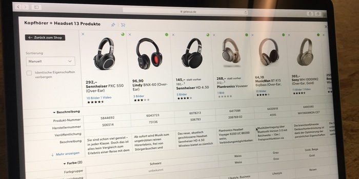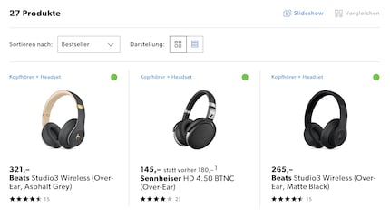 Als Beispiel nehme ich Kopfhörer, weil ich mich da am besten auskenne. Ich habe mit einem Filter alle Over-Ears mit Bluetooth herausgepickt. Unser Sortiment ist noch nicht riesig, da fehlt noch einiges. Den Sennheiser Momentum Wireless und den neuen Sony WH-1000XM3 vermisse ich gleich. Aber immerhin, du kannst schon unter 27 verschiedenen Modellen auswählen. Sind solide Geräte mit dabei.
