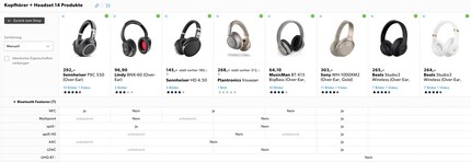 Das Geniale daran: Im Produktvergleich kannst du alle Modelle im Detail vergleichen. Im Falle der Kopfhörer siehst du gleich, welches Modell welchen Codec (AAC, aptX, LDAC) beherrscht. Du siehst auf einen Blick, welcher nur 16 Stunden durchhält und welchem erst nach 30 Stunden die Puste ausgeht.