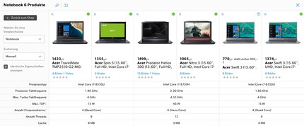 Zweites Beispiel: Notebooks. Wir stehen mit unserem Sortiment noch am Anfang. Wir haben erst 362 verschiedene Notebooks im Angebot. Ich finde schon das unüberschaubar. Allein Acer bietet eine Unzahl an Serien an. Unter «Travelmate» kann ich mir ja noch etwas vorstellen. Aber wer bitteschön kann zwischen «Aspire», «Spin», «Swift», «Extensa» und «Predator» unterscheiden? Und von jedem Modell noch zig Varianten. Die haben doch einen an der Waffel.
