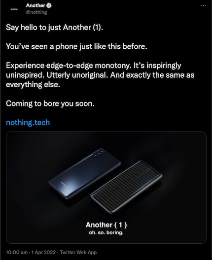 Nothing hat sich auf seinem Twitter-Account geäussert. Die Firma kündigt ein langweiliges Phone namens Another (1) an.
