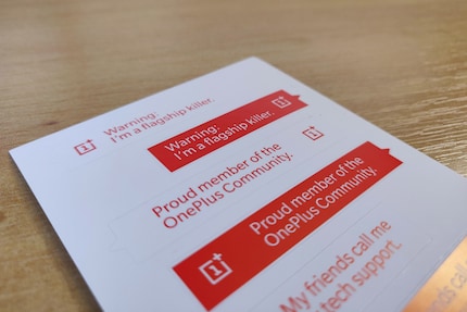 Aber es kommt noch dicker. In der Verpackung selbst liegt ein von OnePlus-Gründer und CEO Pete Lau verfasster Brief, indem er sich an die Käufer wendet um ihnen noch mehr Honig ums Maul zu schmieren. Den Vogel abgeschossen haben die beigelegten Stickers: «Warning: I’m a flagship killer». Das ist so unerwartet dumm, frech und lächerlich, dass ich nicht anders kann, als es leider geil zu finden.