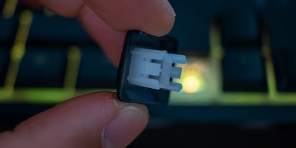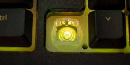 Die Low-Profile-Keycaps sind über jeden Zweifel erhaben. Sie sind aus ABS und bieten guten Grip in hitzigen Gefechten oder beim Schreiben von passiv-aggressiven Microsoft Teams Nachrichten. Weniger gut ist, dass die Tasten relativ viel Spiel haben und deshalb ordentlich hin- und herschaukeln. Das liegt am verhältnismäßig langen Stiel der Switches.