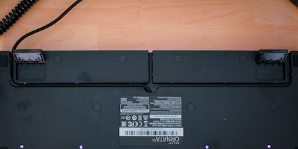 Ebenfalls im Lieferumfang ist eine gepolsterte Handballenauflage aus Kunstleder, die sich magnetisch an die Tastatur heften lässt. Das ist für mich zu Beginn gewöhnungsbedürftig, da ich im Normalfall keine Auflagen verwende. Da die Ornata unten mit 22 Millimetern eher hoch ist, bin ich froh darum. Auch an heißen Tagen ist es nicht unangenehm die Handballen auf dem Kunstleder abzustützen. Das erstaunt mich als Viel- und Starkschwitzer. Die Tastatur lässt sich in zwei Schritten hochstellen, wovon wohl die meisten aufgrund der Bauhöhe der Ornata Gebrauch machen würden.
