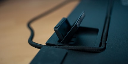 Das textilummantelte USB-Kabel lässt sich an der Hinterseite der Tastatur auf drei Wegen – links, mitte, rechts – von der Tastatur wegführen. Du kannst es jedoch nicht entfernen. Mit zwei Metern Länge ist das Kabel wohl für die meisten Setups lang genug. In meinem Fall sogar zu lang. Schön wäre es, wenn Razer noch eine Möglichkeit gefunden hätte, überschüssiges Kabel auf der Rückseite zu verstecken.