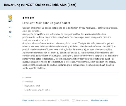 User khrys_neotk hat sich die Kraken x62 zugelegt, eine AIO von NZXT. In seiner Bewertung schreibt er, dass er eine Push/Pull-Konfiguration eingerichtet hat. Damit hat er die Durchschnittstemperatur um durchschnittlich neun Grad gesenkt. Falls dir das alles nichts sagt: Nicht schlimm, ich erklär’s gleich.