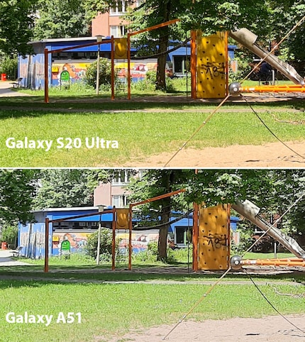 Das Galaxy S20 Ultra verfügt über eine Hauptkamera mit einem 108-Megapixel-Sensor. Die Software rechnet im Normalfall immer vier Pixel zu einem zusammen. Dadurch soll die Bildqualität besser und die Dateien kleiner werden. Das gleiche Prinzip findet auch bei der 48-Megapixel-Hauptkamera des Galaxy A51 Verwendung. Beide Smartphones haben eine Weitwinkelkamera mit einer Auflösung von 12 Megapixeln. Samsung stattet das Galaxy S20 Ultra mit einer Telelinse aus, hinter der sich ein 48-Megapixel-Sensor befindet und einen 100-fachen Zoom schafft. Der ist mehr Marketing als wirklich brauchbar. Bis zu einem zehnfachen Zoom liefert die Kamera gute Ergebnisse. Das A51 hat keine Telelinse. Samsung verbaut stattdessen ein Makrolinse mit fünf Megapixeln. Die vierte Kamera ist jeweils eine Tiefenkamera, die Informationen liefert, damit die Software im «Live-Fokus» den Hintergrund verschwimmen lässt.