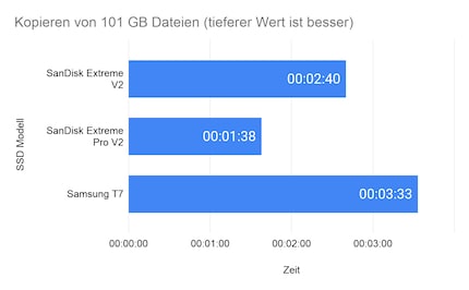 Als erstes ist ein 101 GB grosser Dateiordner mit MP4, RAW-Fotos und einem Premiere-Pro-Projekt dran. Die Extreme V2 benötigt dafür 2 Minuten und 40 Sekunden. Die Geschwindigkeit beträgt durchschnittlich 650 MB/s. Diese kann die SSD während der ganzen Übertragungsdauer durchziehen. Damit ist die V2 53 Sekunden schneller als die T7. Im Vergleich zur V2 Pro zieht sie aber mit über einer Minute Rückstand den Kürzeren.