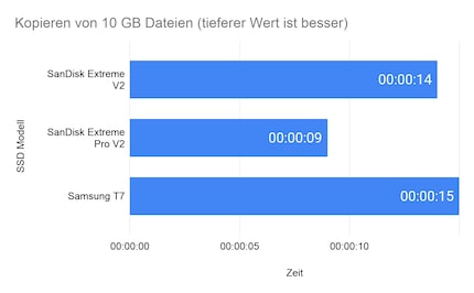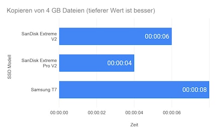 Beim letzten Test kopiere ich noch einen knapp 4 GB grossen Dateiordner mit RAW-Fotos. Die Extreme V2 setzt sich mit 6 Sekunden genau zwischen die T7 und die Extreme Pro V2. Die sind je 2 Sekunden schneller oder langsamer. Die Übertragungsgeschwindigkeit ist aber nochmals kleiner als zuvor: Sie beträgt durchschnittlich 550 MB/s. Der Ordner beinhaltet mehr als 160 Dateien. Deshalb sind hier wieder eher die Lese- und Schreibraten des zufälligen Zugriffs entscheidend.