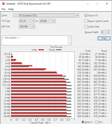 Mit bis zu 977 MB/s beim Lesen und knapp 900 MB/s beim Schreiben erreicht die Extreme V2 nicht ganz die angegeben 1050 MB/s respektive 1000 MB/s. Dennoch sind das sehr gute Werte. Sie schlägt die T7 von Samsung um 20 respektive 43 MB/s. Gegen ihre grössere Schwester hat sie jedoch aufgrund der kleineren Bandbreite keine Chance: Die erreicht beinahe je 1 GB/s mehr, ist also mehr als doppelt so schnell. Sonst verhält sich die SSD wie erwartet. Ab etwa 256 KB Dateigrösse entfaltet sie ihr volles Lese- und Schreibpotenzial.