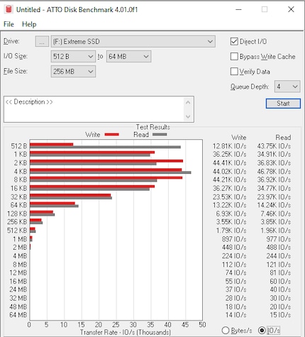 Zum Aufwärmen lasse ich den ATTO Disk Benchmark laufen. Der testet die Lese- und Schreibleistung verschiedener Übertragungsgrössen, von 512 Byte bis 64 Megabyte. Die Angaben zur Lese- und Schreibleistung vieler Hersteller beruhen auf dieser Testmethodik, weil sie die besten Messergebnisse liefert. Bei sequenziellen Zugriffen sind Lese- und Schreibraten deutlich höher als bei zufälligen Zugriffen.