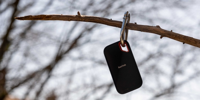 Alle anzeigenKleiner und mit mehr Kunststoff als Aluminium. Sonst sieht die Extreme V2 beinahe so aus wie ihre grosse Schwester, die Extreme Pro V2 Also auch wieder etwas rau und klobig. Schliesslich ist auch die kleine Schwester für draussen und drinnen gedacht. Die SSD ist IP55-zertifiziert, das heisst, sie ist gegen Staub in schädigender Menge und Strahlwasser aus beliebigem Winkel geschützt. Und auch einen Sturz aus zwei Metern Höhe soll das Teil überleben. Die Aussparung oben rechts ist für einen Karabiner gedacht.