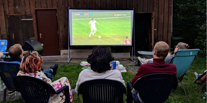 Die Fussball-WM macht mit Freunden, einem kühlen Bierchen und einer grossen Leinwand am meisten Spass. Darum gibt es gefühlt an jeder Strassenecke ein Public Viewing. Vom kleinen Café, das den Fernseher nach draussen stellt, bis zu den Megaevents mit tausenden von Zuschauern. Wer's gemütlicher mag und einen Garten hat, der organisiert sein eigenes Public Viewing – sollte die WM schon vorbei sein, kriegst du so immerhin dein eigenes Openair-Kino.