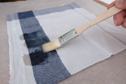 Den Baumwollstoff lege ich auf einem Backpapier aus und bepinsel ihn gleichmässig mit der Wachsmischung. Da diese relativ schnell fest wird, musst du zügig arbeiten. Das Bestreichen muss nicht perfekt sein, das ist auch kaum möglich. Es soll einfach auf der ganzen Fläche verteilt sein. Und zwar nur einseitig. Die Baumwolle zieht die Flüssigkeit so gut auf, dass sie gleich durchzieht.