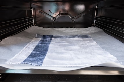 Um das Ergebnis zu optimieren, kommt das Tuch samt Backpapier für etwa zwei bis drei Minuten bei 80 Grad in den Ofen. Das Wachs verflüssigt sich wieder etwas und verteilt sich gleichmässig auf dem Stoff. Nach dem «Backen» wedelst du das Tuch ein paarmal durch die Luft und hängst es dann einige Minuten am Stewi auf. Danach sollte es durchgetrocknet und bereit für den ersten Einsatz auf deinen Schüsseln sein.