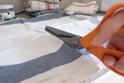 Damit das ganze Unterfangen so nachhaltig wie möglich wird, setze ich auf alten Stoff. Da ich massenweise Geschirrtücher besitze, die augenscheinlich noch aus der Vorkriegszeit stammen, sind diese das Textil meiner Wahl. Mit der Zickzackschere schneide ich Quadrate und Kreise in verschiedenen Grössen aus. Warum nimmt sie keine normale Schere, fragst du dich? Weil ich nicht will, dass der Stoff ausfranst. Das Bienenwachs sollte die Kanten eigentlich so gut versiegeln, dass das nicht passiert, aber sicher ist sicher. Zudem sieht’s ganz nett aus.