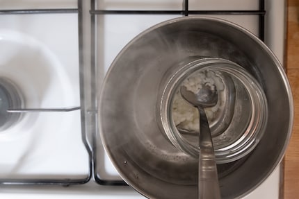 Dann bringe ich die Bienenwachslinsen zum Schmelzen. Dafür gebe ich fünf Esslöffel in einem Weckglas ins heisse Wasserbad. Unter regelmässigem Rühren und auf mittlerer Flamme dauert es etwa zehn Minuten, bis das Wachs flüssig wird. Zum Schluss kommt ein Esslöffel Kokosöl dazu, um das Ganze geschmeidiger zu machen.