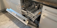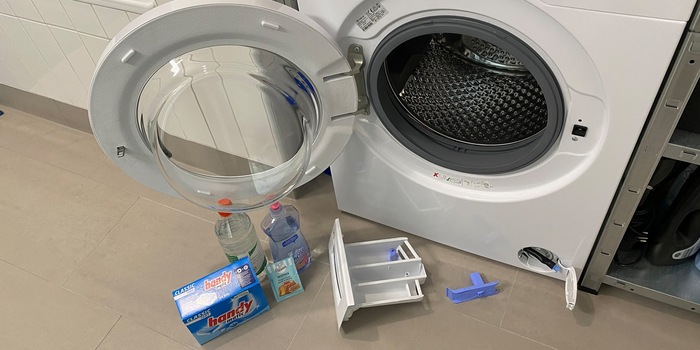 Als nächstes nimmst du dir das Waschmittelfach vor. Prüfe, ob du das Fach komplett herausnehmen kannst. Meist geht dies mit einem leichten Druck auf eine entsprechend gekennzeichnete Stelle hinten beim Weichspülerfach. Kommt das Fach vollständig heraus, entfernst du es, legst es in warmem Wasser ein und gibst ein paar Spritzer Geschirrspülmittel bei. Während das Ganze einweicht, widmest du dich dem Bereich, in dem das Fach gesteckt hat. Diesen wischst du mit demselben Essig-Wasser-Gemisch von der Innenreinigung und einem Putzlappen gründlich aus und trocknest es danach mit einem Küchentuch ab. Danach spülst du das im Wasser eingelegte Fach ab, wischst es mit einem Lappen sauber und trocknest es so gut wie möglich. Schlussendlich kommt es zurück an seinen Platz. Schiebe es jedoch nicht ganz zu, damit allfällige Restfeuchtigkeit entweichen kann. Kannst du das Fach nicht komplett entfernen, dann ziehst du es so weit wie möglich heraus, reinigst es mit einem im Essig-Wasser-Gemisch befeuchteten Putzlappen und trocknest es mit einem Küchentuch.