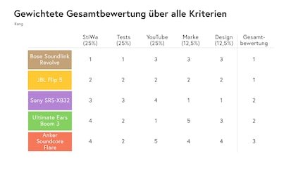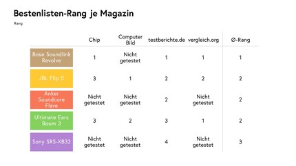 Klarer Fall: Der Bose Soundlink Revolve holt in jedem Magazin den ersten Platz. Dahinter verdichtet sich das Feld. Der JBL Flip 5, der UE Boom 3 und der Soundcore Flare von Anker landen gemeinsam auf dem zweiten Platz. Allerdings gibt es vom Soundcore Flare und dem Sony SRS-XB32 aktuell nur wenige Tests.