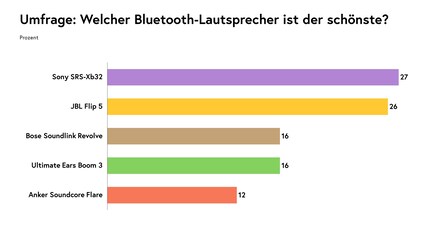Die Stiftung Warentest hat sich mit dem Ton, dem Akku und der Benutzung beschäftigt – Faktoren, die einer gewissen Subjektivität unterliegen, aber durchaus gut mess- und bewertbar sind. Wir ergänzen sie um den sehr subjektiven Faktor «Design». Welcher Bluetooth-Lautsprecher trifft nur beim Ansehen den Geschmack der Massen? Dafür haben wir eine – nicht repräsentative – Umfrage in unserer Community durchgeführt.