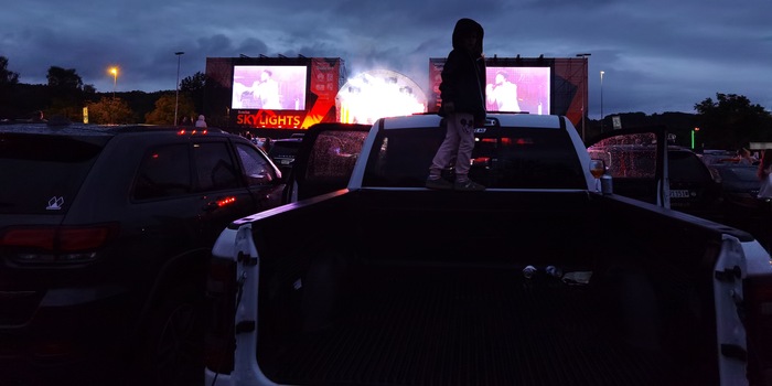 Ein kleines Mädchen neben meinem Pickup sieht nichts. Aufs Dach des Jeep Grand Cherokee ihrer Eltern kann sie nicht klettern, obwohl das Versprechen vorher scheinbar abgegeben wurde. Ich öffne die Pickup-Fläche meines Dodge Ram 1500, sie klettert hoch und kann Luca Hänni zusehen. Sie ist zwar wegen Loco Escrito hier, aber aktuell spielt Luca auf. Sie ist eine der maximal 1500 Personen am Sunrise Skylights Festivals, an dem 300 Autos auf dem Parkplatz vor der Bühne stehen und hören via Radio zu.