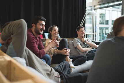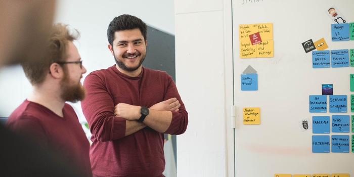 Sie halten sich in der Arbeit an ihre zweiwöchigen Sprints, stehen immer unter Zeitdruck. Dann setzen sich die fünf Backend Engineers, die zwei User Experience Designer, der Frontend Engineer, der Product Owner und der User Experience Researcher – also das gesamte Team – zusammen und diskutieren. Was hat funktioniert? Was nicht? Wo könnte etwas angepasst werden.