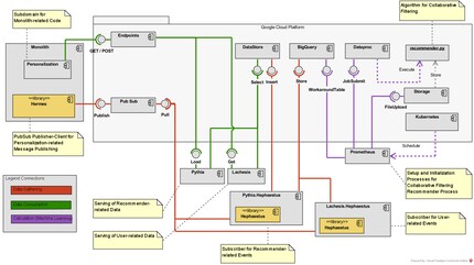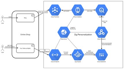 Alle anzeigen«Wir wollten View Events in Google PubSub pushen, von wo sie mit Cloud Dataflow verarbeitet und in BigQuery gespeichert würden. Für die Berechnung würde dann nächtlich ein Cloud Dataproc Job gestartet, welcher die Daten aus BigQuery einliest, Collaborative Filtering macht und das Resultat pro Kunde in Cloud Datastore speichert. Um die berechneten Daten auszulesen war vorgesehen, eine AppEngine Instanz zu haben, welche über einen Cloud Endpoint angesprochen wird und die Resultate aus Datastore ausliest. Das ganze würde dann zentral in Stackdriver geloggt.», schreibt das Team auf der Development Site.