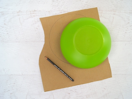 1. Zeichne mit einem Bleistift einen Kreis auf den Karton. Den Durchmesser kannst du frei wählen. Ich habe als Schablone eine Salatschüssel genommen. Du kannst den Kreis jedoch auch mit einem Zirkel ziehen.