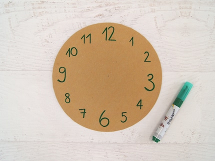 3. Beschrifte die Uhr mit Zahlen. Falls du Hilfe bei der Positionierung brauchst, machst du mit dem Bleistift und einem Lineal oder Geodreieck kleine Markierungen.