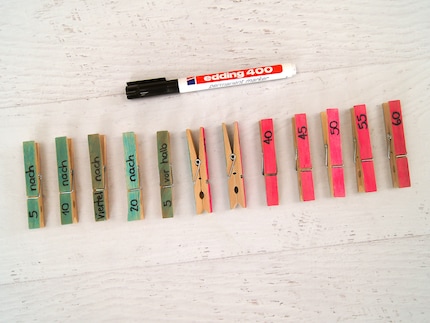 5. Beschrifte die Wäscheklammern mit einem schwarzen Marker. Auf der einen Farbseite schreibst du mit Worten, wie wir die Uhrzeit aussprechen. Auf der anderen schreibst du sie mit Zahlen.