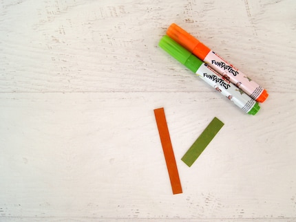 6. Schneide den kleinen und grossen Uhrzeiger aus Karton zu und bemale diese ebenfalls in zwei unterschiedlichen Farben.