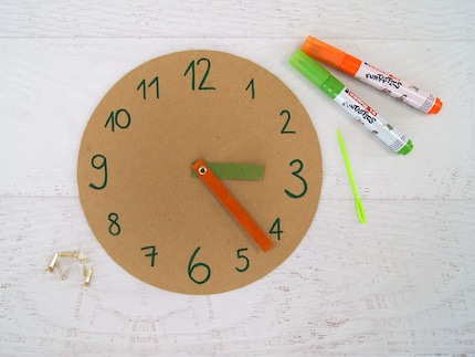 7. Stich mit einer Nadel ein Loch durch die Mitte der Uhr und am Rand der beiden Zeiger. Befestige zuletzt die Uhrzeiger mit einer Rundkopfklammer an der Uhr.