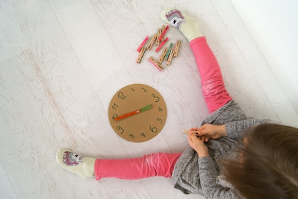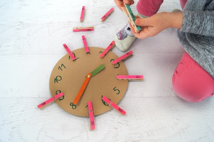 Alle anzeigenDein Kind darf die Uhrzeiten stellen, indem es die Zeiger verschiebt und du sagst ihm, wie spät es ist. Am Anfang konzentriert ihr euch lediglich auf den Stundenzeiger. Danach folgt der Viertelstundentakt mit dem Minutenzeiger. Im Tagesablauf kann dein Kind die Uhr immer wieder neu stellen und festigt so sein Wissen. Nun könnt ihr die Rollen tauschen. Du stellst die Uhrzeit ein und dein Kind sagt dir, wie spät es ist. Wenn dein Kind lesen lernt und bereits grössere Zahlen beherrscht, zieht ihr die Wäscheklammern hinzu. Dein Kind darf dann die «Klüpperli» der passenden Zeit zuordnen.