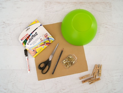 Die Lernuhr kannst du aus unterschiedlichen Materialien basteln. Ich habe dafür einen alten Karton und Wäscheklammern verwendet. Ausserdem brauchst du Filzstifte, eine Rundkopfklammer, eine Schere, eine spitze Nadel und einen Bleistift. Als Hilfsmittel für das Zeichnen des Kreises kannst du eine Schüssel oder einen Zirkel verwenden.
