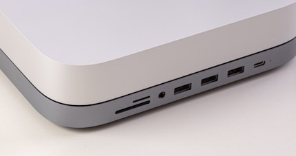 Mit dem Satechi-Dock habe ich eine optisch elegante Lösung gefunden. Sie verschandelt das Gerät nicht und braucht keinen zusätzlichen Platz auf dem Schreibtisch. Mir ist egal, ob der Block 3 oder 5,5 Zentimeter hoch ist. Preislich liegt das Dock auf der günstigen Seite. Neben den zusätzlichen USB-Anschlüssen bietet das Dock Kartenleser für SD- und microSD-Karten sowie einen Kopfhörer-Ausgang. Das alles ist auf der Frontseite bequem erreichbar, sodass ich beim Einstecken keine Verrenkungen machen muss.