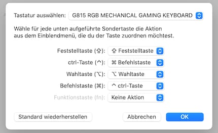 Du kannst pro Tastatur angeben, welche Sondertaste auf welche Funktion gemappt werden soll. Ich habe zum Beispiel die Ctrl-Taste zur Befehlstaste gemacht, weil ich mir das von Windows so gewohnt bin. Dies, obwohl auch der Mac eine Ctrl-Taste kennt, die aber viel seltener gebraucht wird.