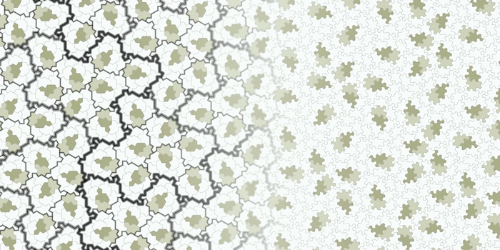 Wie das Team in seiner früheren Veröffentlichung feststellte, lassen sich durch Veränderungen der Kantenlängen des Huts weitere Fliesenformen finden, die ebenfalls lückenlose Pflasterungen erzeugen. Als der pensionierte Druckanlagentechniker David Smith eine dieser Fliesenformen aus Papier zurechtgeschnitten hatte und damit herumspielte, fiel ihm etwas Spannendes auf: Wenn er die Kacheln zusammensetzte, ohne sie zu spiegeln, schien sich ein lückenloses, nicht periodisches Muster zu ergeben.