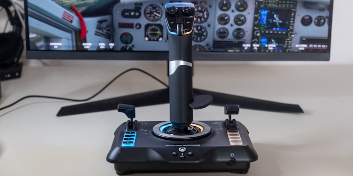 Der Flightstick lässt sich links und rechts rotieren, womit sich das Seitenruder bedienen lässt. In Kombination mit dem Trimmrad am Flightstick selbst und dem Schubregler rechts, den ich für die Landeklappen benutze, habe ich auf kleinstem Raum alle wichtigen Bedienelemente für den kurzen Flug mit einmotorigen Maschinen. Spielereien wie eine eingebaute Stoppuhr für den Sichtflug runden das Paket ab. Bei anderen Controllern hat mir stets irgendetwas gefehlt. Hier bin ich wunschlos glücklich. Aber das hat seinen Preis: Die Schubregler sind so kurz, dass perfekte Justieren nicht möglich ist. Die Buttons müsste ich beschriften, da ich ihre Funktionen gerne vergesse. Für längere Unterfangen ist mein Honeycomb Setup daher noch immer Trumpf.