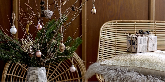 Schmücke das Arrangement wie einen Baum, sobald es standfest ist. Das geht vielleicht nicht ganz so üppig, aber dafür eindrucksvoll. Pro Farbe greifst du lediglich zu einem Aufhänger oder zu einer Weihnachtskugel. So kombinierst du unterschiedliche Stile miteinander. Es kann aber auch wirkungsvoll sein, das Grün im monochromen Look zu dekorieren. Wie du dich auch entscheidest, einige der Ornamente müssen schimmern.