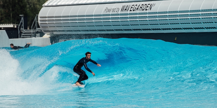 Erst kommt die S-Bahn. Zumindest klingt es so, wenn die Module der Anlage zu arbeiten beginnen, sich und das Wasser in Bewegung versetzen. Ein leises Surren dringt aus dem Bauch der gewölbten Konstruktion neben mir, die an ein Gewächshaus erinnert. Dann schwillt der Wasserberg an, hebt und senkt mich in der Dünung, zieht vorüber. Es gibt keine Hektik, kein Gedränge, keine überraschend früh brechenden Wellen. Im Gegenteil, es gibt sogar Markierungen.